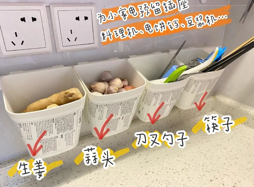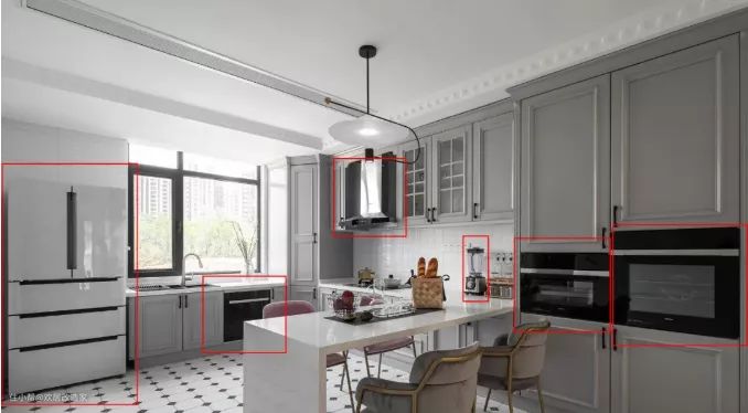 具体布局:冰箱、蒸箱、烤箱、油烟机各占1个,小家电2-3个,方便电饭煲、微波炉等用电器的使用。