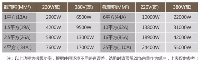 一般来说,家庭用电的电线有:1.5平方、2.5平方、4平方、6平方、10平方这五种规格,不同规格的电线所对应的功率和使用场合也是有区别的,如下图: