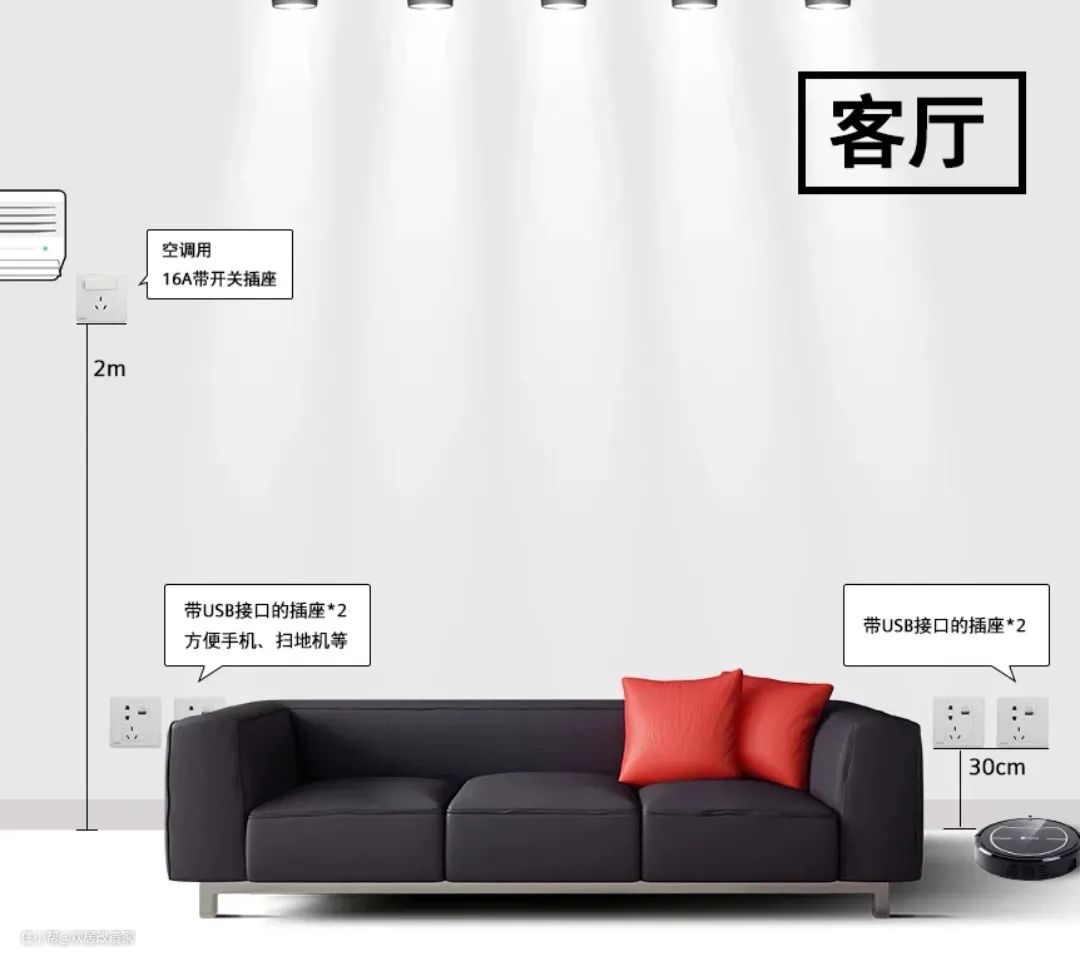 沙发墙高处也要预留一个16A带开关插座,供空调使用。