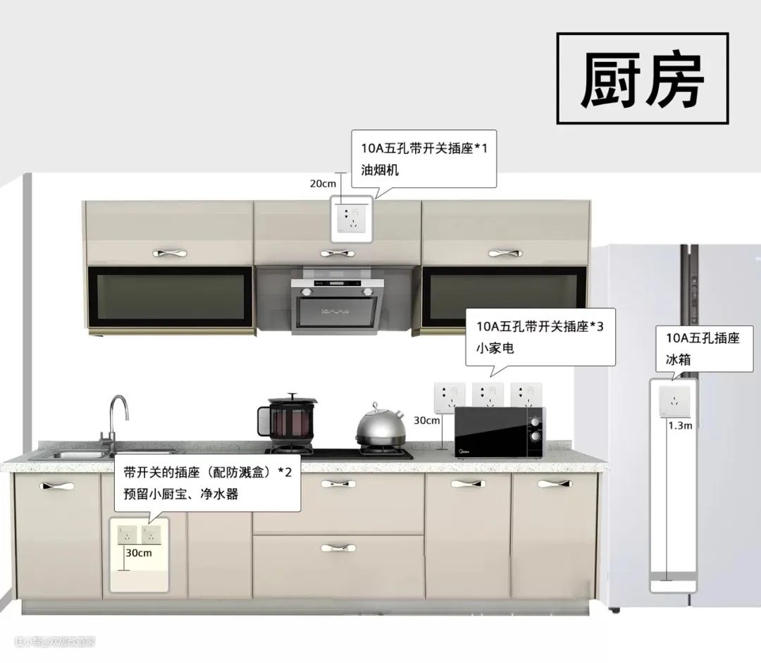 厨房的插座要远离水、火、油污和蒸汽,不然不安全!可以大量使用带开关的10A五孔或三孔插座,这样像微波炉、油烟机之类经常使用的电器,就不用经常插拔插座,更加安全便捷一些。