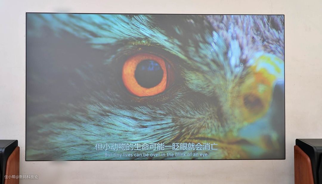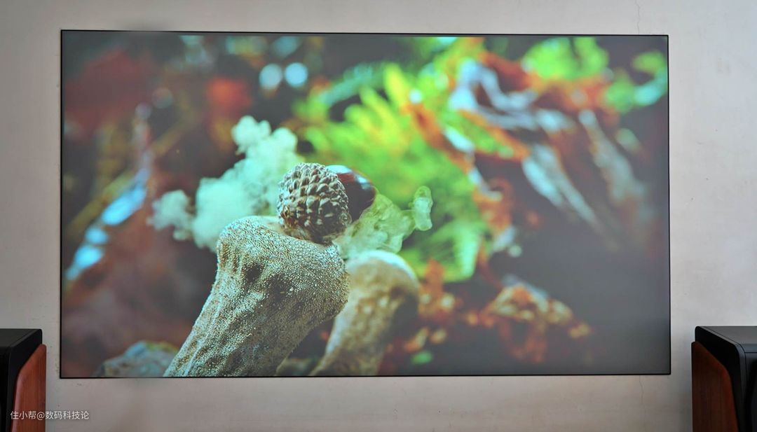 当然,这可能与我使用了菲斯特画卷S1光学屏有一定关系。为了减少这个屏幕本身带来的画面抗环境光的影响,我也在正午时分,拉非遮光窗帘,同样投影100英寸画面在白墙上与光学屏上做了对比。这个可能更为直观,2050ANSI 流明,只要避开正午强光,基本上其他时段不拉窗帘都能使用。