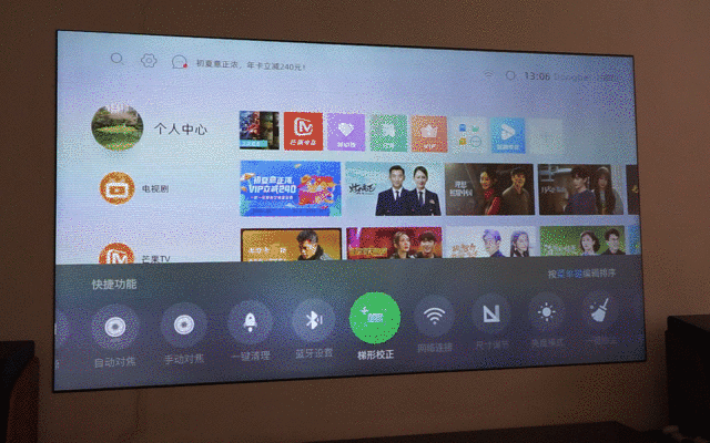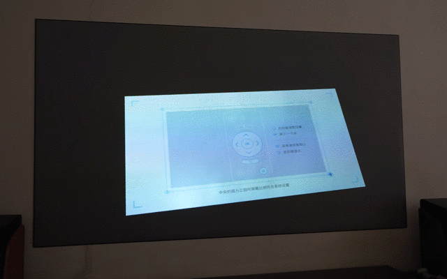 这样的话预留的空间,完全可以做更好的四角梯形校正,获得更规整的画面。而梯形校正功能,这款产品支持手动校正、自动校正正(正投适用),还可以开启实时校正功能。如果相对固定地方使用的话,其实手动校正就够,但如果你常常搬动位置使用,就会感觉到自动校正的强大。其支持30%的校正,下面是手动校正的动图展示: