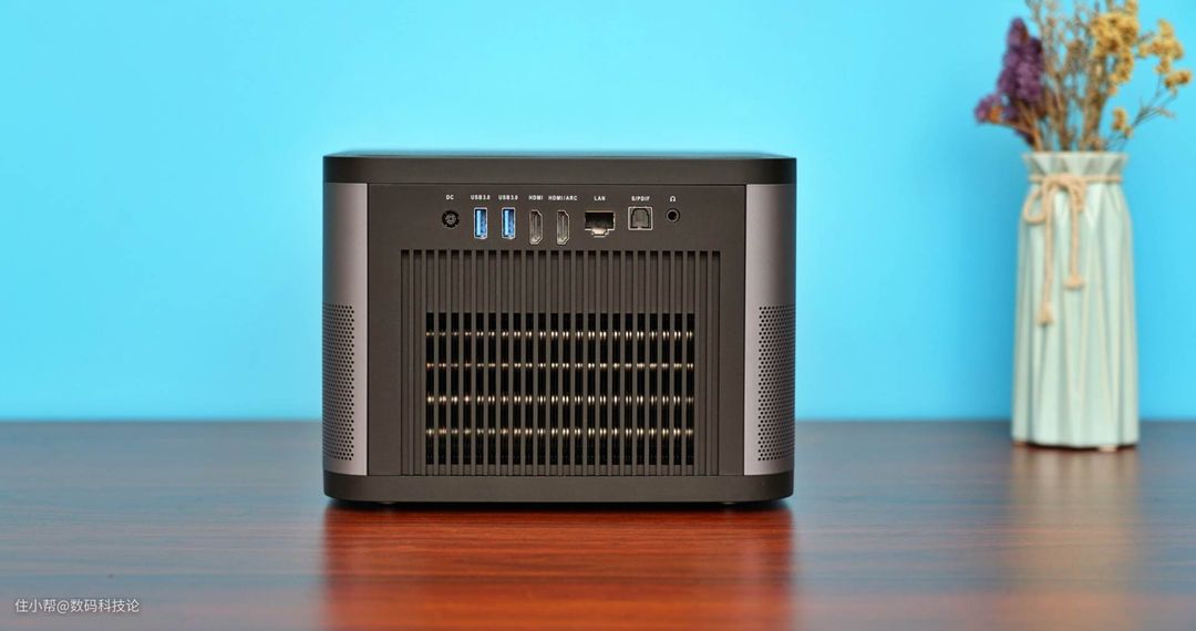 前侧是全光学玻璃镜头以及双TOF+COMS的自动对焦系统,下沿7cm的宽度范围密集的激光打孔像一条腰带围在机身正侧三面。双8W扬声器以及扇热进风口都隐藏在这个侧裙的铝合金围板内。