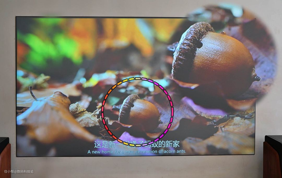 再比如掉落的榛子,局部放大也是很清晰。这样的放大带来的视角变化,相当于观影者从3米的距离移动到了1米的距离来观看,画面依旧不会有颗粒感。当然反过来说,有没有颗粒感还与片源有关系,好片源才能发挥产品的高配特点。