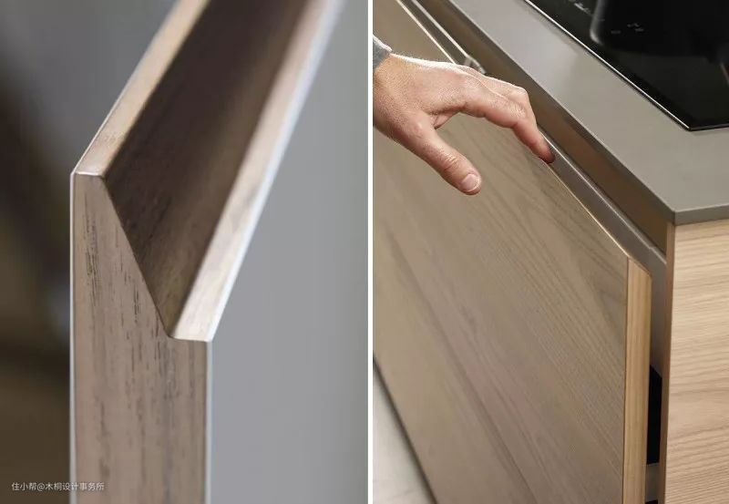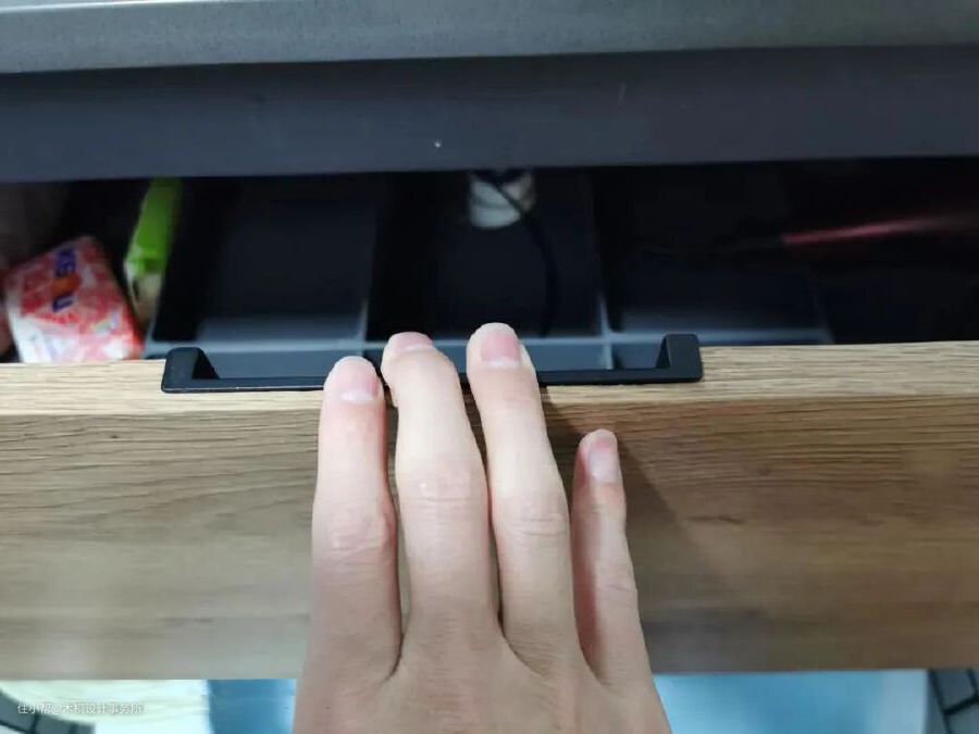 像一些吊柜、抽屉等悬空的柜门,可以将柜门向下加长5mm左右作为受力点,这样的柜门直接不用任何拉手,就可以直接拉开,而且也非常轻松。