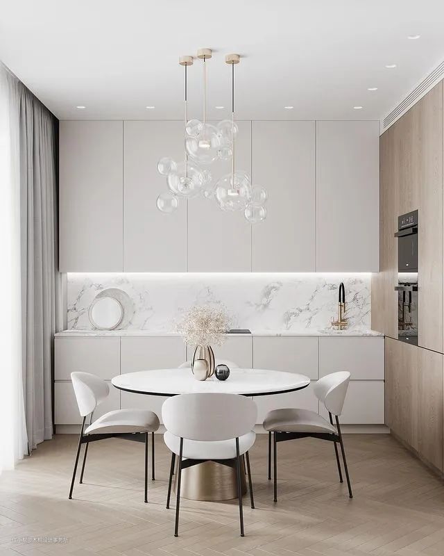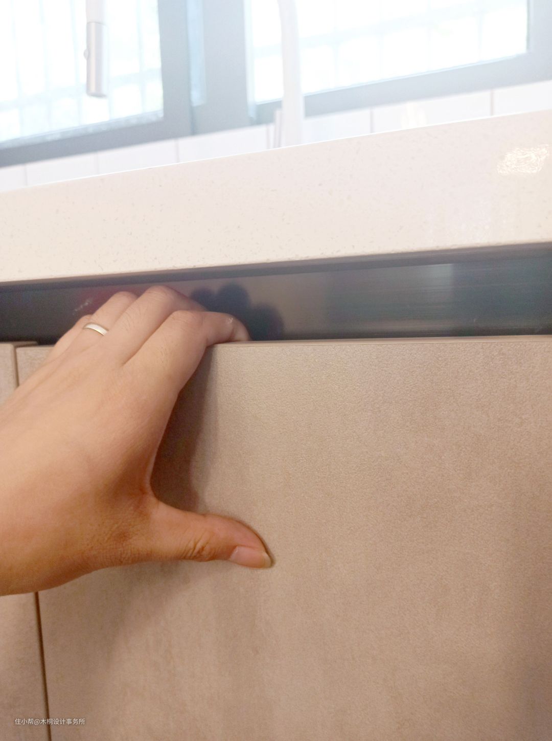 对于一些底柜,可以在门板之间或者门板与台面之间预留2-3cm左右高度的槽,这样可以留出手指伸进去的位置,这样也可以实现无把手开启柜门。