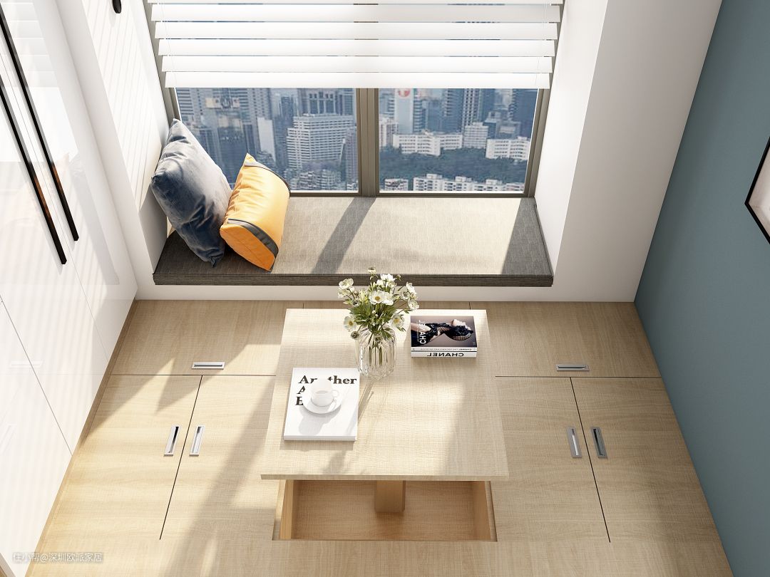 ▲榻榻米与飘窗齐高,解决多功能房普遍存在的小空间视野狭窄的问题。相信闲暇之余,枕着柔软的靠枕,坐在飘窗上,看着窗外的风景,感受在家的惬意休闲时光,也是不错的选择。