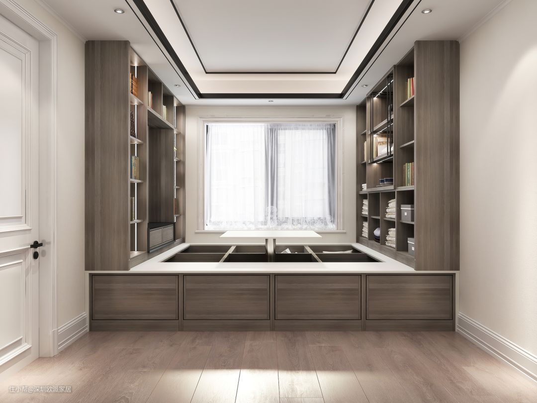 ▲如果对对存储空间有更高的要求,想要让收纳空间UP !UP !UP!也没问题,U型设计榻榻米多功能房满足你的需求。靠墙两侧到顶做两面开放式格架,做好空间大小不同的区划,后期根据你的需求分类、分层摆放,还会害怕收纳不够?