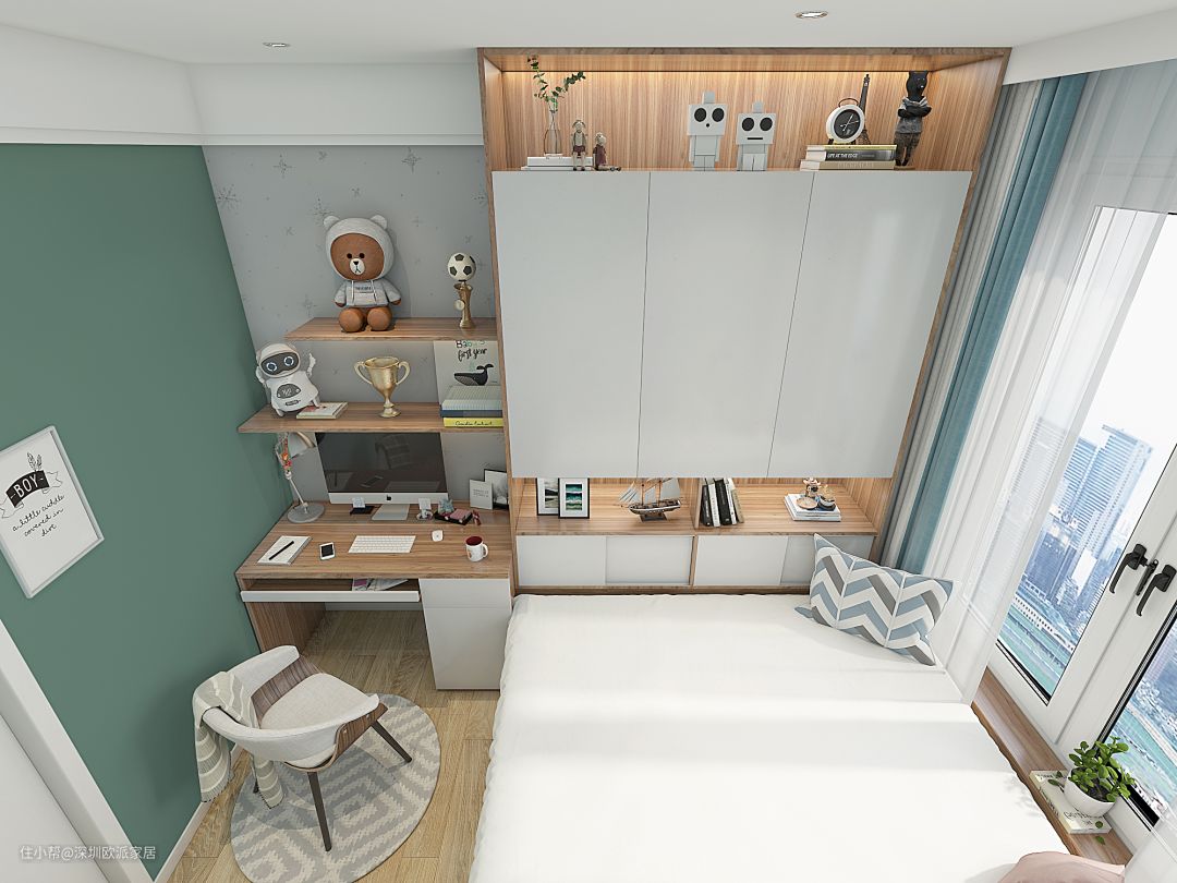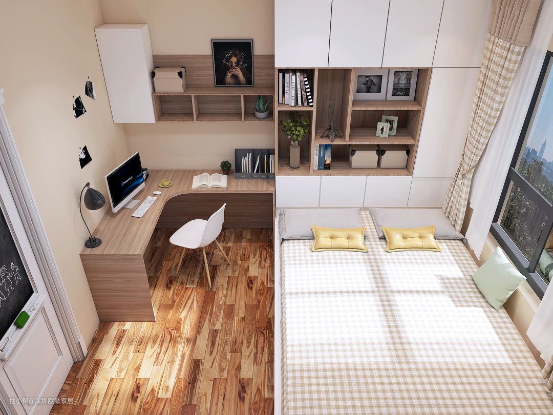 ▲利用墙角空间,打造转角书桌,增加书桌台面面积,满足日常工作学习、休息和收纳需求,宽敞地足够家中两个人同时办公或学习,营造良好工作学习,舒适度直线提升的同时也让房间整洁自然。