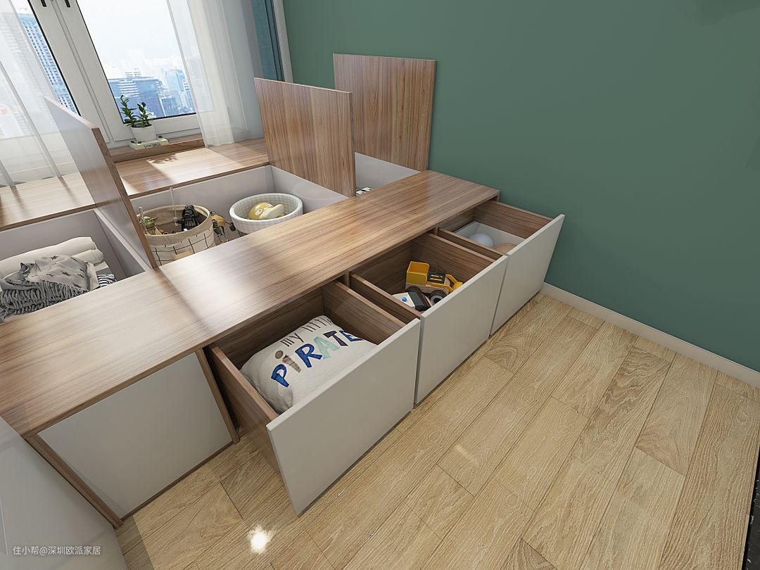 ▲侧面做抽拉式榻榻米,存放常用、常取物品,如孩子的玩具。再也不用费劲地将榻榻米上的物品搬来搬去了,超省力!