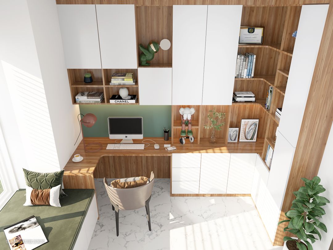 ▲喜欢读书,想要一个书房的业主,相信会喜欢这个书柜到顶设计,书桌上方做书柜收纳,只需要站起来,就能随取随用需要的书籍和资料,大大提升工作和学习效率。
