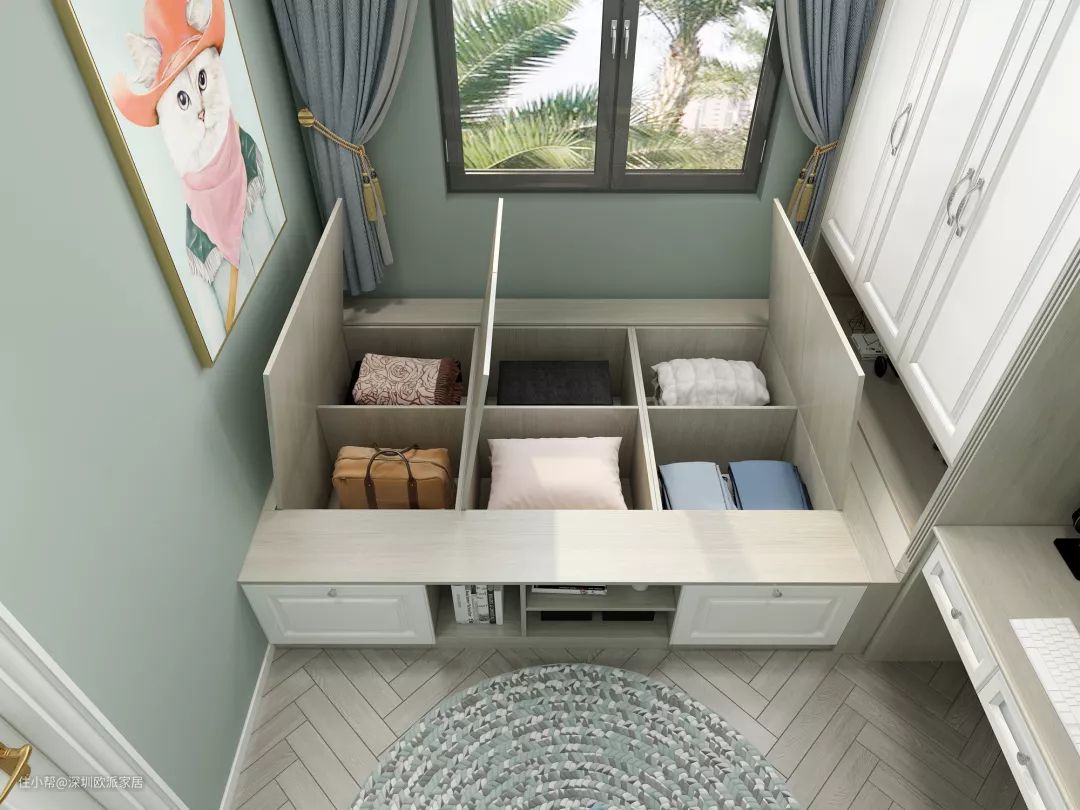 ▲翻盖式榻榻米收纳不常用的物品,如过季衣物、冬季大棉被、大棉袄。杂乱的大件物品不怕没有地方摆放而落灰了,隐藏式收纳,让房间干净整洁,再也没杂乱的衣服乱入。