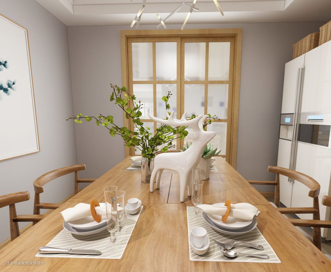 一要看清菜,二要看清人。一盏吸顶灯确实可以搞定餐厅照明,但不能给餐厅带来高级感。为了突出美食,餐厅灯光可以选择适当高度的吊灯或筒灯,不仅使餐厅更有个性,同时照亮了整个餐桌,营造出轻松的氛围!