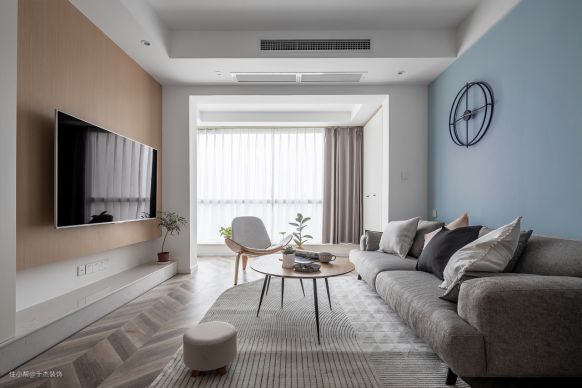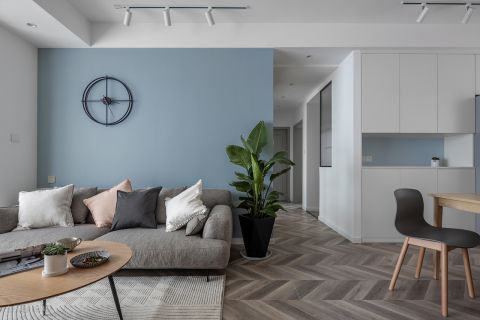 整个客厅的背景在蓝、灰、棕之间交替演变,柔雅的色调打造出更为简洁大方的待客体验,再加上家具填充少而精,以中性色调作为补充,令视感充盈而富有趣味的同时,又结合清晰的线条打造出利落大方的时尚视感。