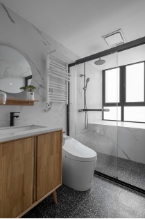 卫生间采用干湿分离的布局设计,原木色简约台盆柜,黑色金属白玻璃,在整个略显灰色系的空间里显得格外小资、现代,毕竟每一处的设计都精雕细琢,质感与时尚并存。