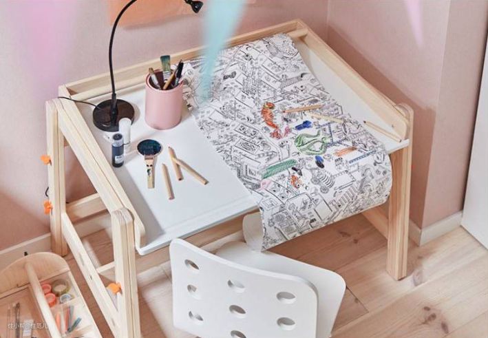 同样能调节高度,以及方便画画收纳,与宜家不同的是,卷筒画纸在侧边,70cm宽的大桌面,可以让小朋友面对面进行互动。