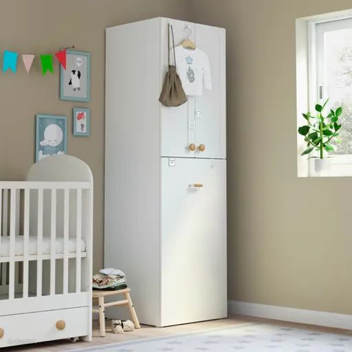 窄长的柜体,很适合小户型的儿童房。上下门的设计,方便孩子独立使用下层,上层则先由父母帮助收拾不常穿的衣物。