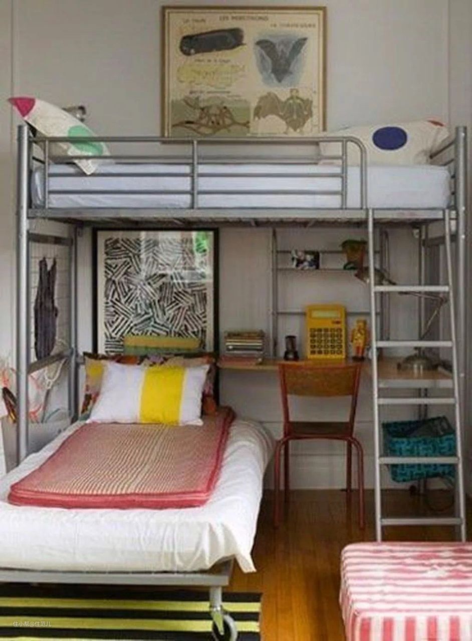 如果空间充足,加床还有一种思路,将下床与上床垂直摆放,充分利用侧边位置,下床也不会太压抑。