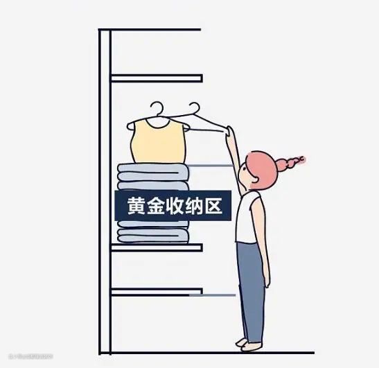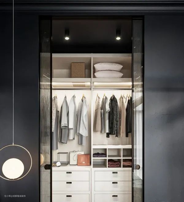 悬挂区的位置可以根据自己的取拿习惯任意安排,一般在整个衣柜的中段。对于易皱的衣服以及长款大衣是非常友好的。不仅能一眼挑选到需要穿着的衣物,而且能保持衣服的整洁。但是要注意挂杆的高度,太高了,拿取不变,太低了,下摆容易起皱,最佳高度应该是使用者身高的1.2倍。