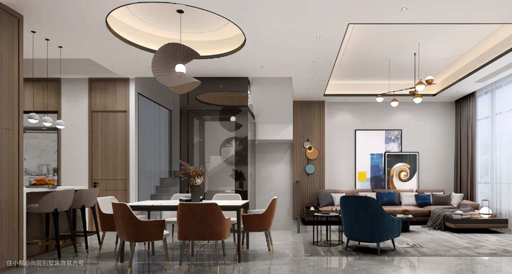 客厅是全家的活动中心,是生活的重心所在,一般都占据着重要的采光、观景面,棕色皮质沙发,加上原木墙壁装饰,在高级质感中注入原始生命力,浅色木纹的修饰让空间有着和谐之美。圆形和方形不一的造型配上设计感十足的吊灯,成为客厅里的一道风景线。