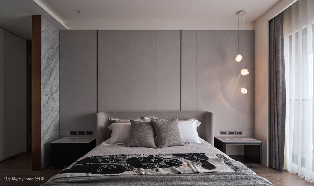 主卧入口藉由一玄关功能,让进入空间的人们心思有所缓冲、沉淀,金属镶嵌与浅色绷布勾勒出细腻的轮廓,一旁高地错落的现代灯饰,亦是精采点缀,勾勒出精品饭店般的优雅氛围。
