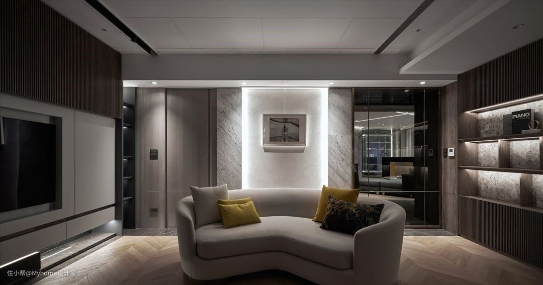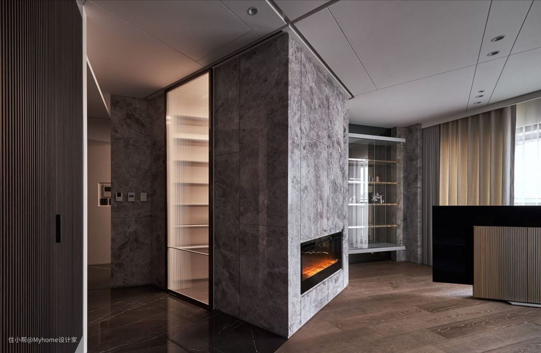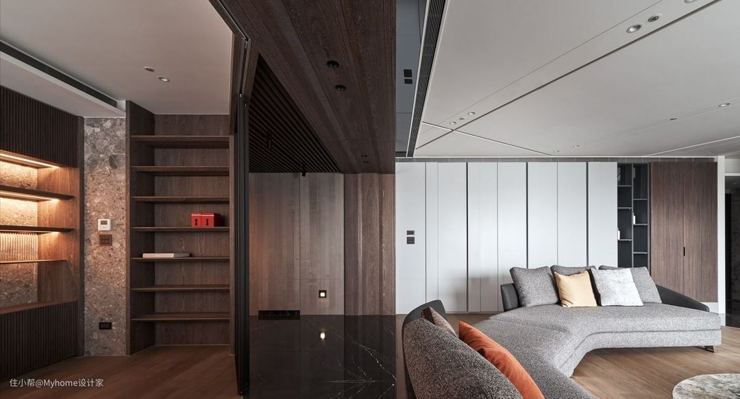 异材质的堆栈与细节衔接,流露工艺之精髓,在起居室的书房的柜体,在基底使用石材、木质和灯带融合,结合客制化的理念,不断精进、与世接轨的美学,在低奢美学中吐露新意。