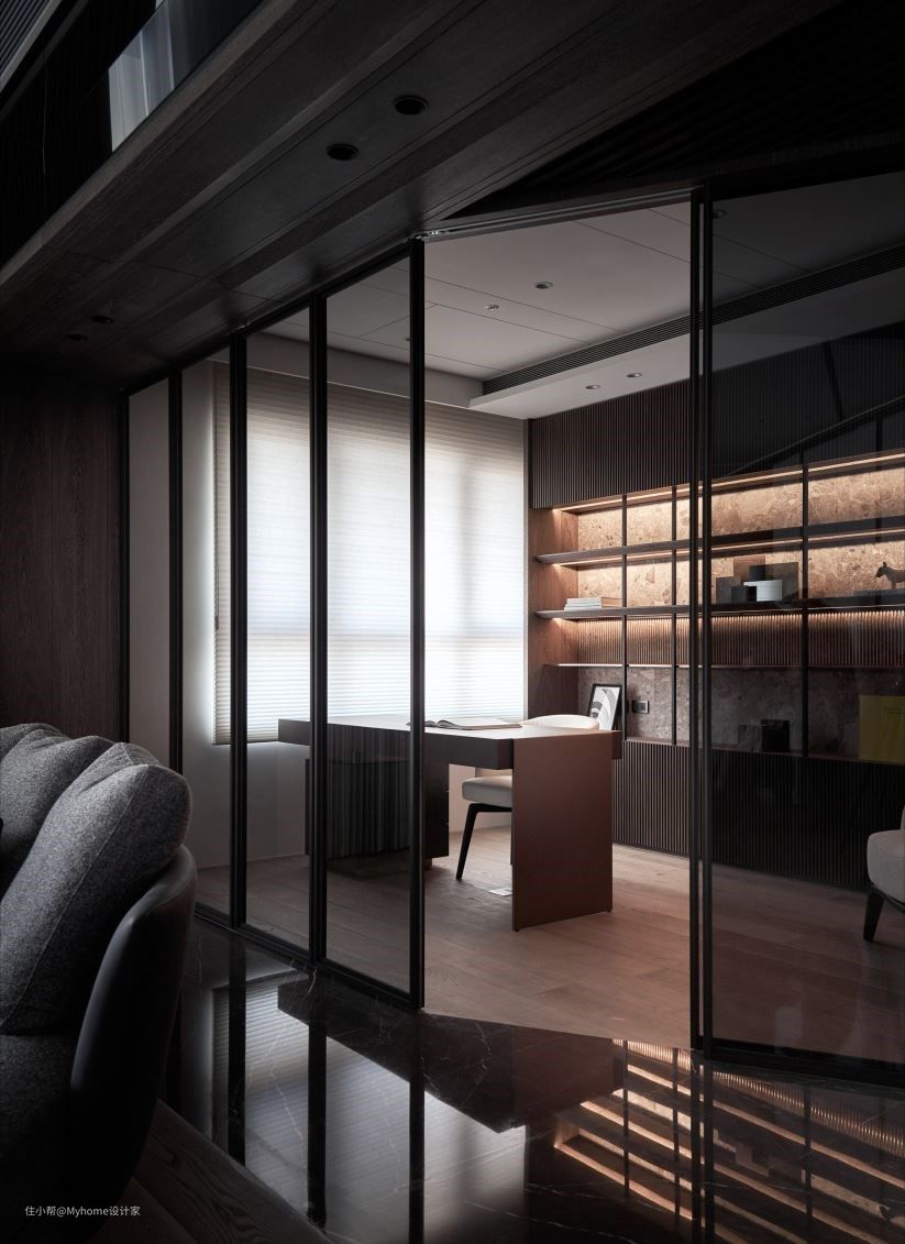 公共空间的界限已然模糊,似离而合的格局形成一种连接,书房规划为L型玻璃面,让书房成为有趣的L型玻璃面,彷佛一间玻璃盒子,低调而迷人。