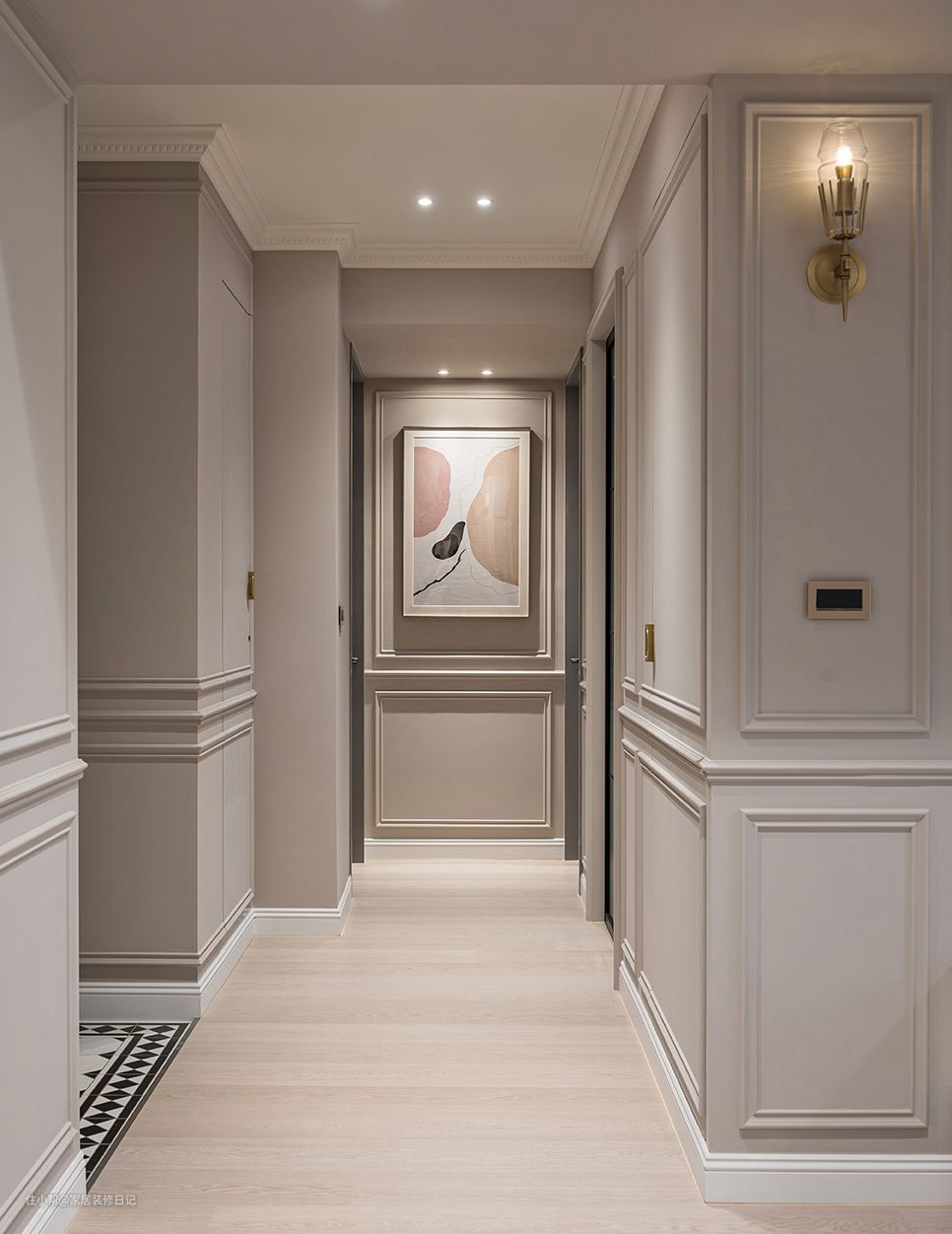 墙面加了线条框装饰,让墙面更有层次感,而且利用墙面做了许多内嵌式收纳柜,增加许多收纳空间。