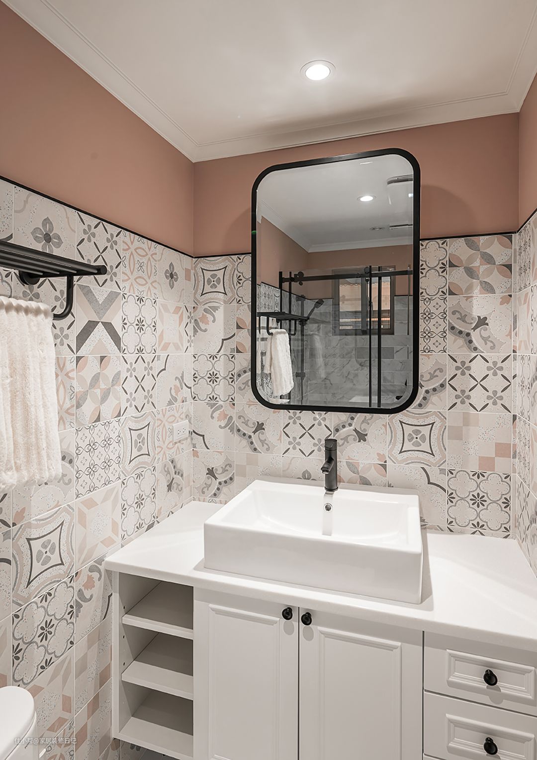 主卧卫生间延续主卧室的粉色,以1:9的视觉比例区分色块和壁砖面积,搭配纯白简约的卫浴柜体,凸显花砖活泼的视觉效果。