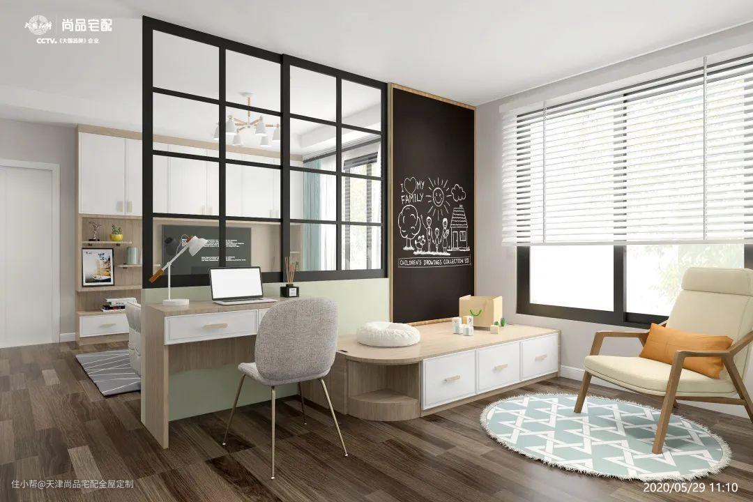 另一种方法是用半墙+玻璃隔断,在沙发背后做一个隔断隔出一个休闲空间,既能小憩又能储物,安全性更有保障,休闲区设计黑板墙供孩子绘画涂鸦。