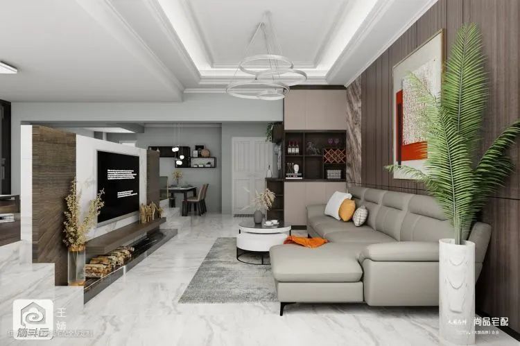 有人喜欢沙发靠墙,小尚想到的是利用电视背景墙作为客餐厅之间的隔断。