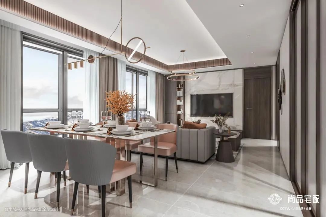 如若横厅过大把客厅、餐厅、厨房一字排开,客餐厅之间利用卡座+柜体隔断,节省空间的同时增加了储物面积,有序收纳不凌乱。