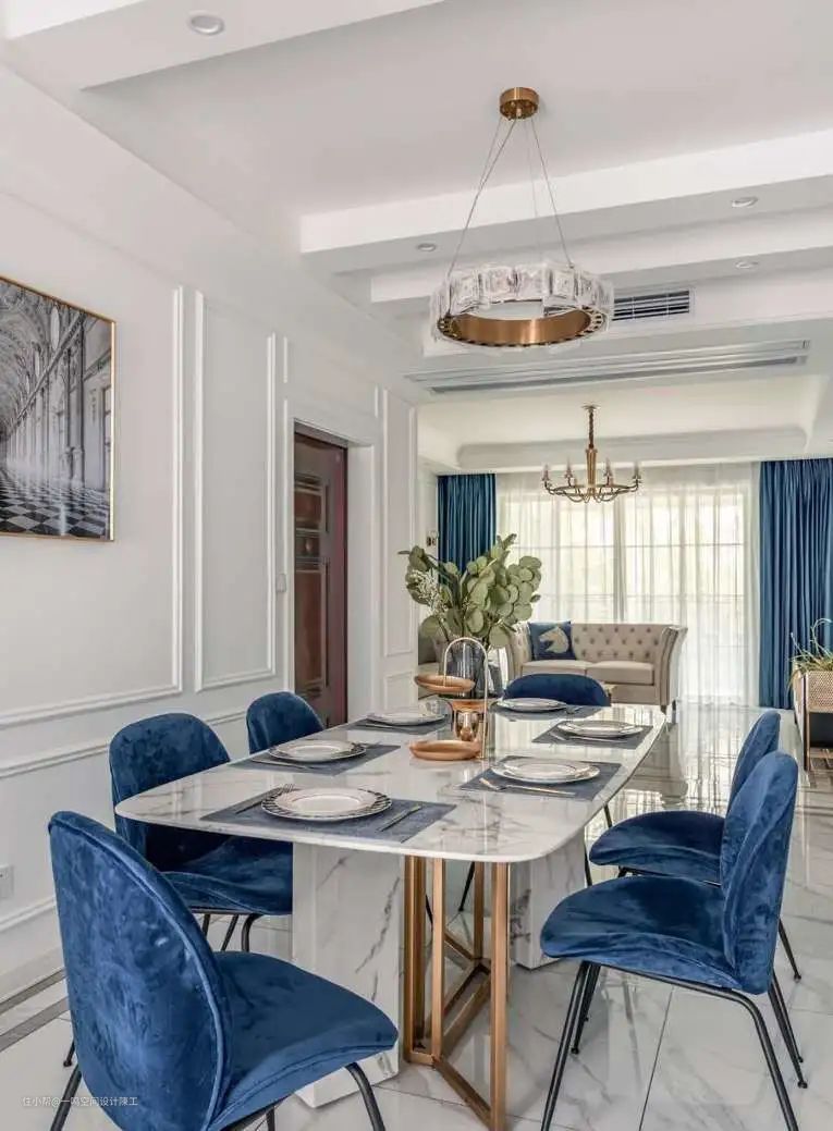 采用纯白色石膏线在天花板上勾勒造型来完成房顶和墙面的完美过渡,不仅可以美化空间还能营造出优雅高贵的艺术效果兼具现代与古典气息,装饰作用满分。