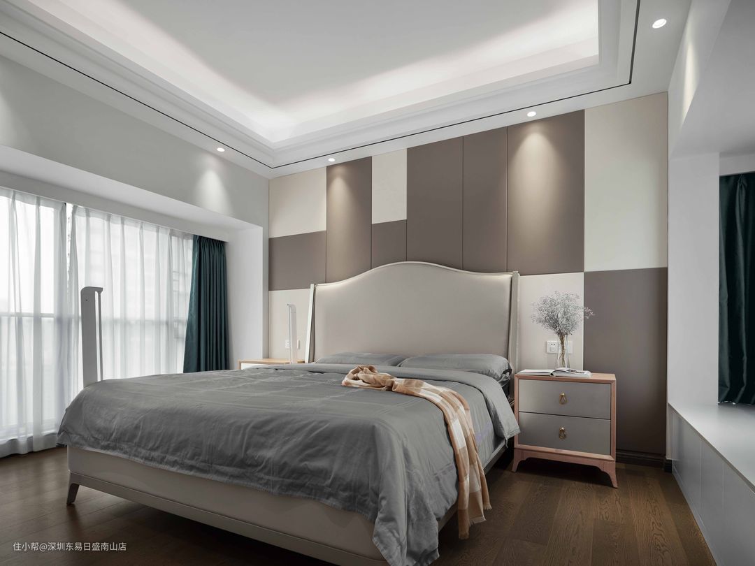 与客厅背景墙相同的装饰面,错落分布,,皮质软包大床头,低奢中带着沉稳。玫瑰金的床头柜,精致感满满。与客厅不同的是,采用木饰地板通铺主卧,高级灰的床被,低调奢华。#主卧设计#高级灰#轻奢