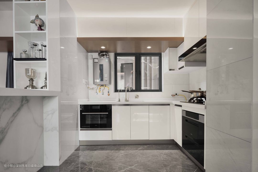 通过改造,拆除了两面墙,封闭式厨房改造成开放式厨房。L型厨房动线,方便王姐的走动。靠餐厅原墙面如今变为一个可收纳的吧台,互动性非常强。#厨房设计#吧台#改造#大理石