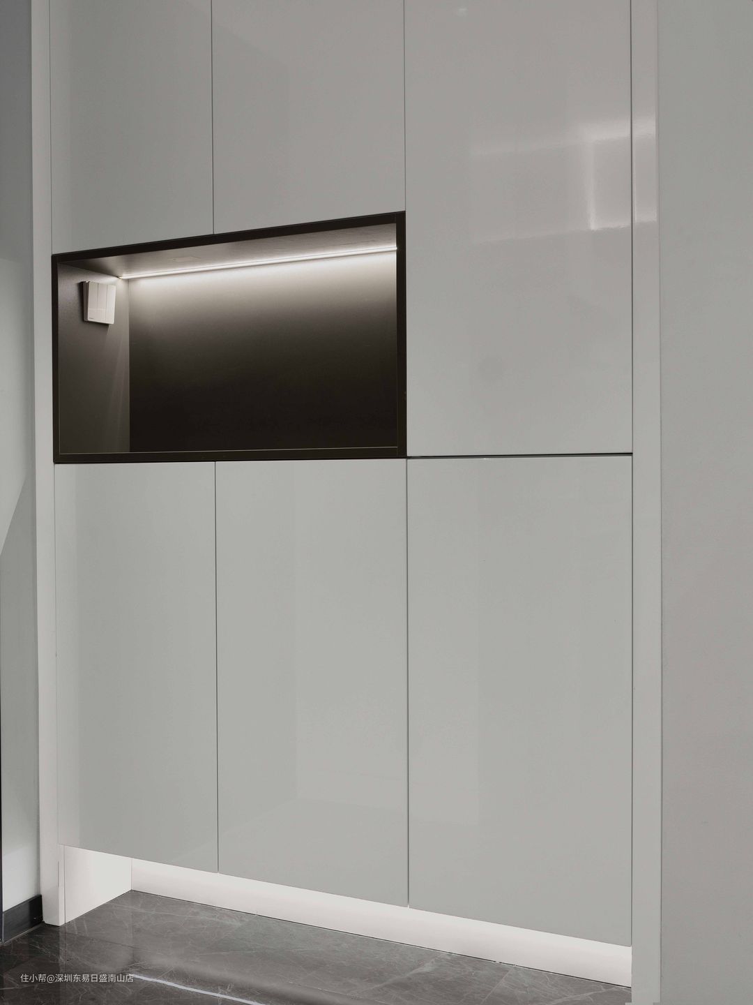 入户左边便是一个嵌入式玄关柜,白色柜体,中格黑框,上下灯带提亮。带来极致时尚感。目前很多玄关都采取下镂空形式,方便置换日常出行居家鞋子。#玄关#轻奢#柜子#收纳。