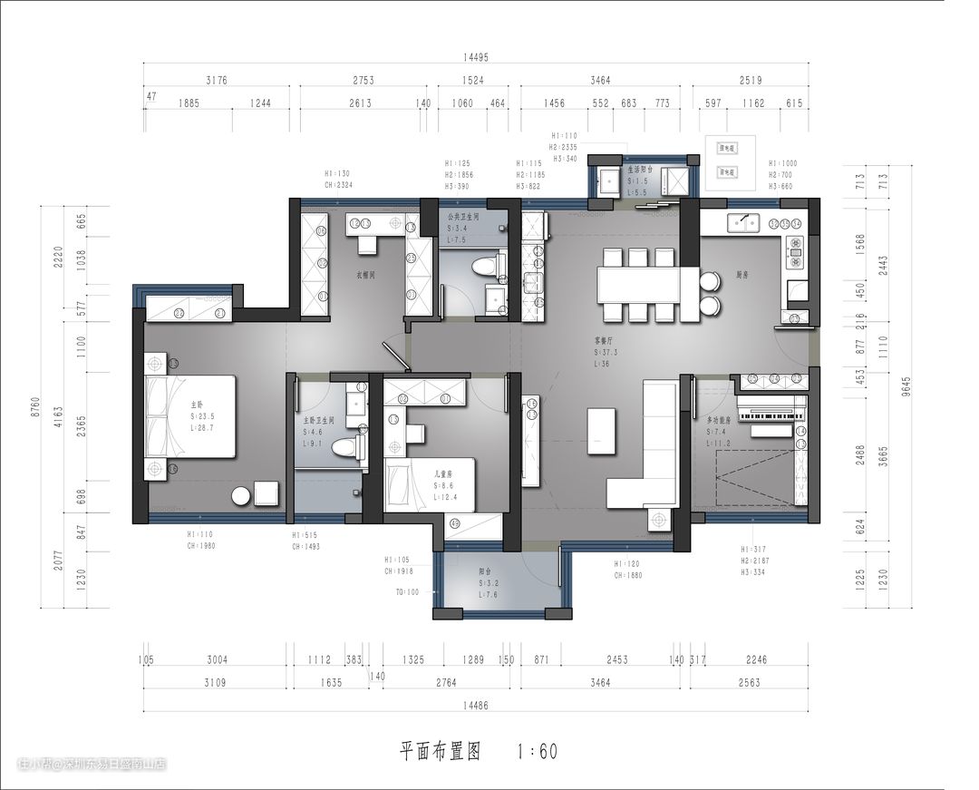 空间格局:客厅、餐厅、玄关、开放式厨房、休闲阳台、生活阳台、主卧、儿童房、多功能房、主卫、公卫。