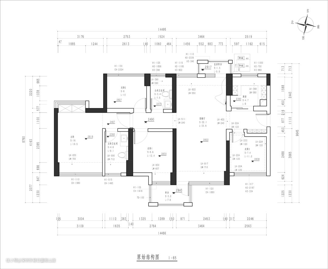 1.户型方正,朝向正南,动静功能,公共与私密区域划分明确。