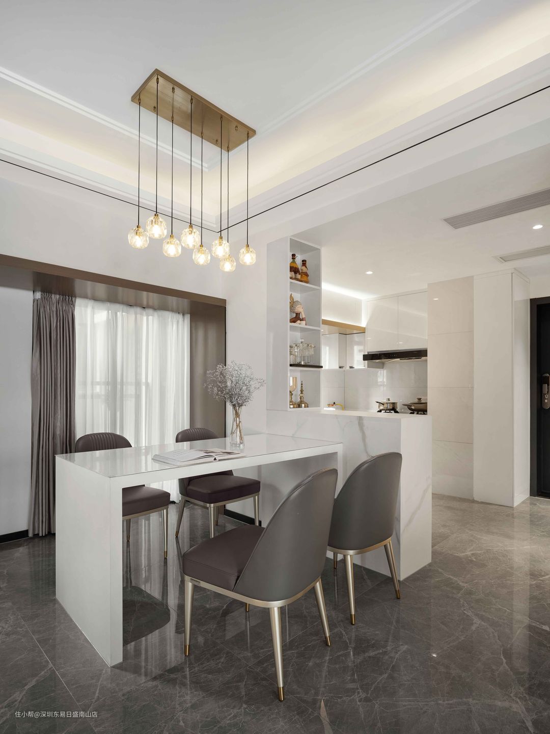 连接厨房吧台的餐厅,玻璃质感的台面,时尚简约。#餐厅#轻奢#高级灰