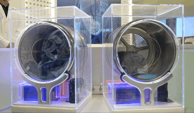 在AWE现场以干衣机透明外部,也更清楚地了解到海尔双擎热泵干衣机和传统干衣机工作时的不同表现。传统干衣机一般只能做到内筒单向顺时针旋转,而海尔双擎干衣机可以做到全时1:1正反转。