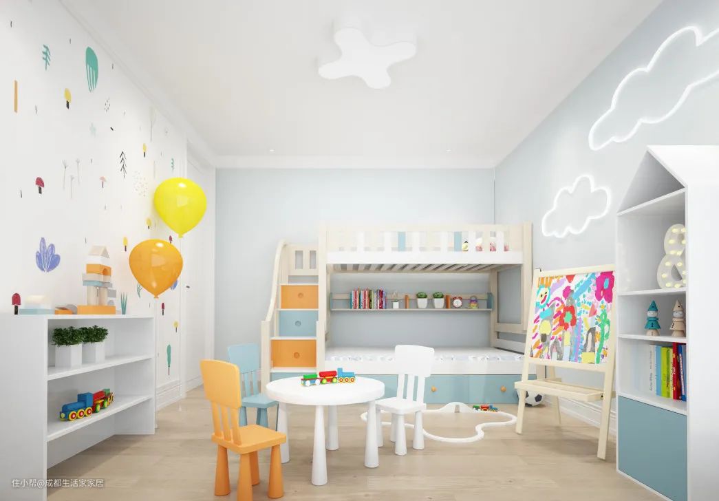 经济条件允许,可以打造小乐园,比如滑滑梯+床的设计,但如果房子面积不大,实用最重要,有足够的空间,放一些玩具就可以了。