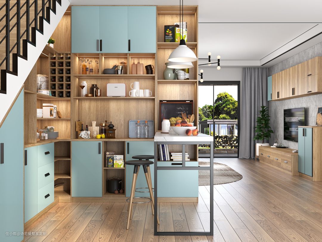 定制一个楼梯下的餐边柜,自带吧台,打造一个楼梯下的“小卖部”,邀请朋友来品尝你新调的小酒。餐边柜同时还充当了隔断柜的作用,隔开入户与客厅,和朋友在吧台聊天的你,不会打扰到在客厅看电视的老公。又美又实用,简直太爱!