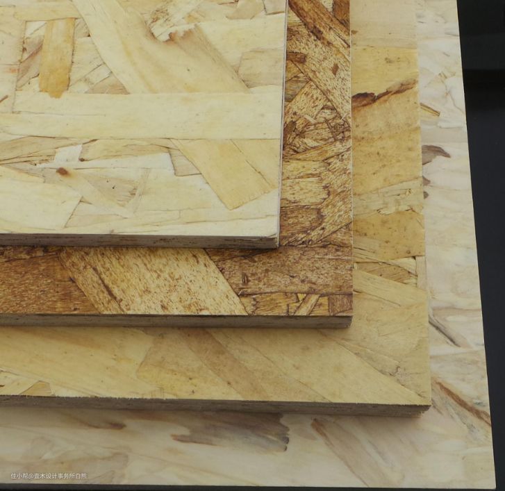 颗粒板还有个强度升级版本,叫定向刨花板,也叫欧松板/OSB板,拥有人造板中最强的物理性能,一般用来做吊顶龙骨、窗帘盒、门框、墙板甚至建筑墙体。