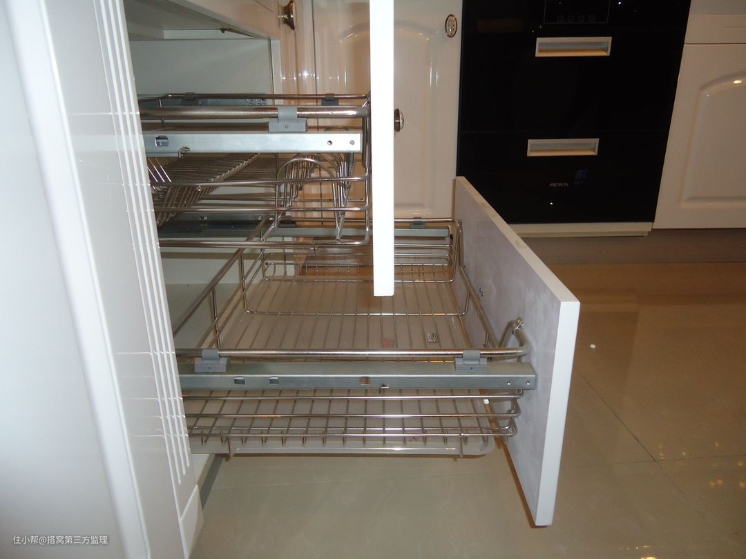 3.橱柜中的拉篮主要是放调料、碗碟、锅等厨房用品和用具,扩大了橱柜的使用效率。选购拉篮要注意尺寸和材料,一般是按照橱柜的尺寸量身定做,拉篮的材料一般就是不锈钢的,可不锈钢是有很多种的,选购时一定要擦亮眼。还有一点,拉篮的承重能力要强,尤其是一些放置锅碗瓢盆的拉篮。