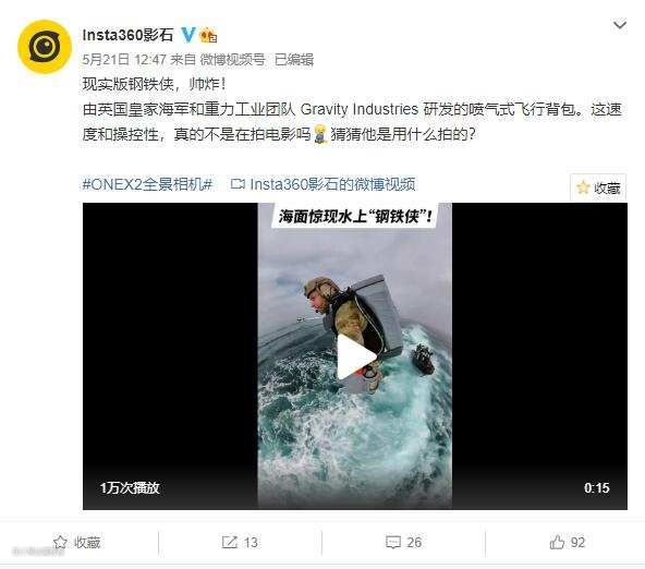 另一个国产品牌——Insta360 影石,前一阵英国皇家海军和重力工业团队 Gravity Industries公布了所研发的喷气式飞行背包,而公布的视频便是用Insta360 影石录制的。