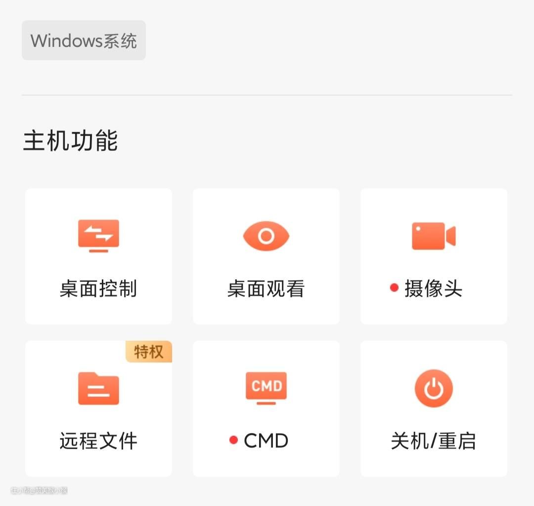 进入电脑界面后可以看到,对于远程控制的电脑,这里提供了六种远程操作,分别是电脑的开/关机,桌面控制,桌面观看,摄像头,远程文件,CMD功能。