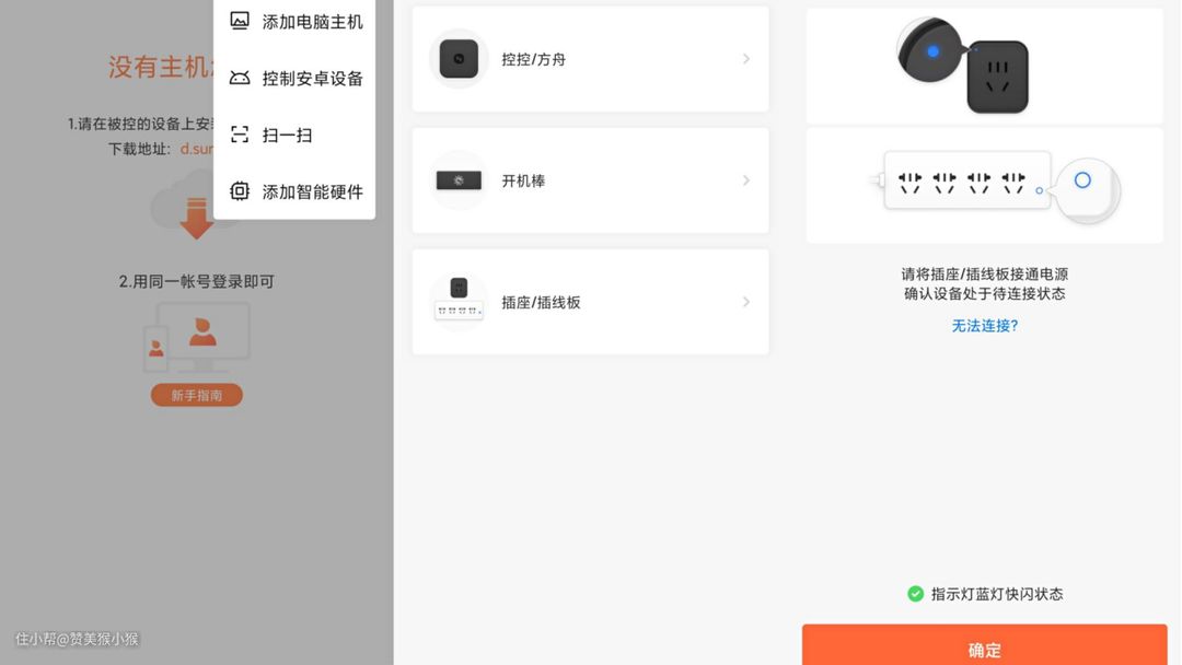 进入APP首页,点击右上角+号进行添加设备。此时插座指示灯为蓝灯闪烁状态下,点击确定即可。