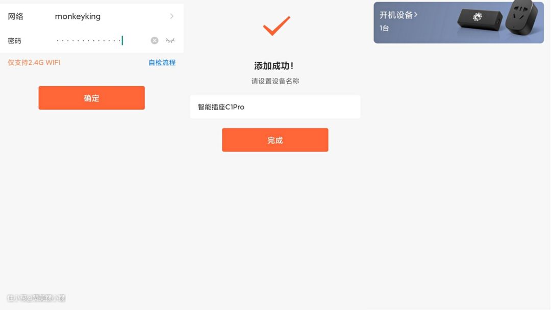 显示添加成功后,还可以对智能插做的名称进行自定义,完成自定义后点击完成。添加完成后会在主界面里显示接入的设备名称,这里显示开机设备。点击后进入插座管理界面,这里可以看到自定义的插座接入产品名称,从而可以清晰的操作每种电器。