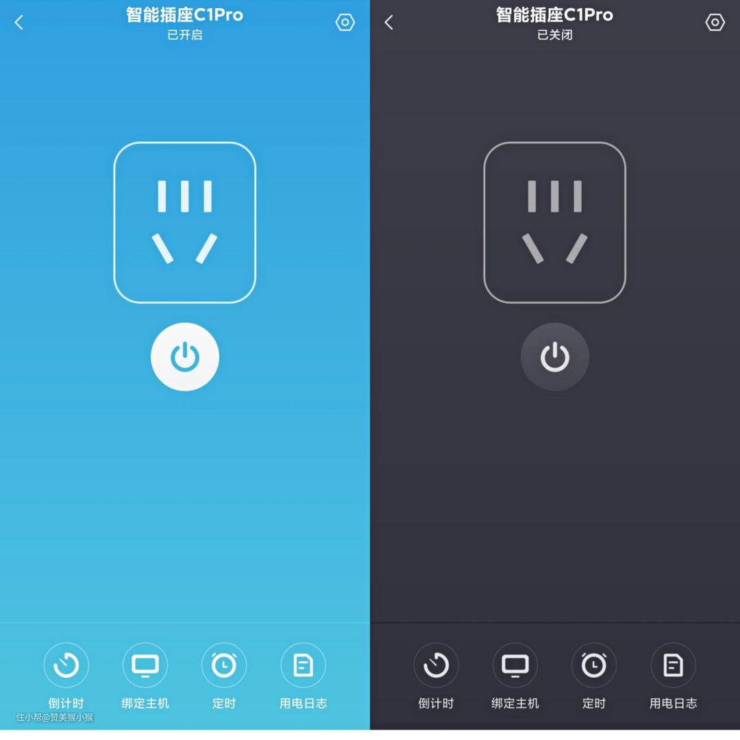 接着进入任意一个插座控制界面看看,可以看到插座的主界面有一个五孔插座的图像,下方则是图形化的开关键,根据不同开断状态操作界面呈现蓝黑两种颜色状态。