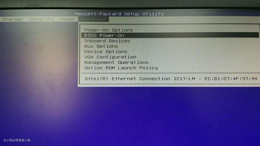 这里以HP工作站为例,设置过程首先进入BIOS设置界面,然后进入高级选项->BIOS Power-on